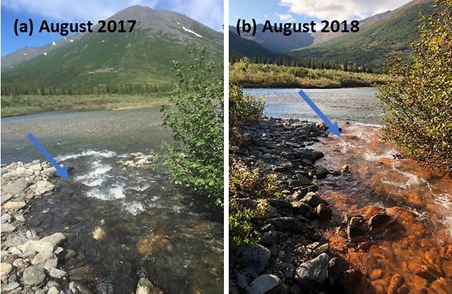| ▲ 알래스카 코북 밸리 국립공원의 아킬릭 강 상류 지류 이미지. 2017년 6월 12일의 맑은 하천이 2018년 8월 30일엔 주황색 하천으로 변했다. |