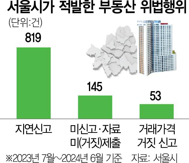 위법행위 유형으로는 ‘지연 신고’가 819건으로 가장 많았다. 부동산 거래가 체결되면 계약일로부터 30일 이내에 거래 정보를 관할 지자체에 신고해야 하는데 이를 위반한 경우다. 이어 미신고 및 자료 미(거짓)제출 건수가 145건, 거래 가격 거짓 신고가 53건으로 뒤를 이었다. 시는 이번 조사를 자체 개발한 부동산 동향 분석 시스템을 활용해 진행했다. 위법행위가 의심되는 거래 신고 건에 대해 거래 당사자 등에게 계약일, 거래 금액, 자금 조달 계획서 등 확인이 필요한 거래 내역에 대한 자료를 제출받아 집중 조사를 실시했다고 설명했다.