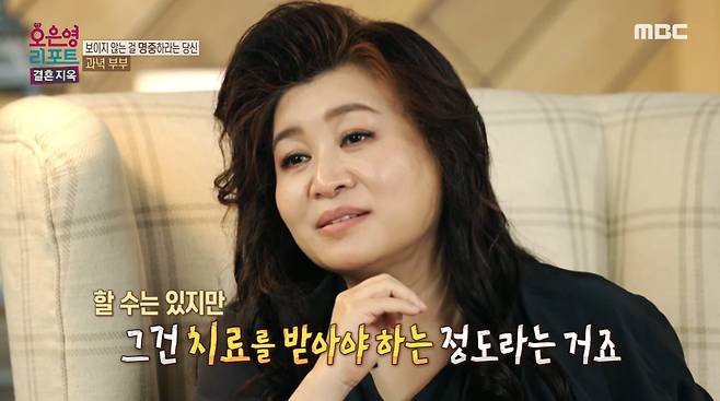 오은영은 "아내 분이 망상까지 진행되는 것 같아서 염려된다"라며 "치료받아야 한다"라고 권했다. 또한 "대뇌 불균형이 있다고 보고 걱정하는 것"이라며 "망상은 타인이 아니라고 말할수록 견고해지기 때문에 치료가 필요하다"고 당부했다.