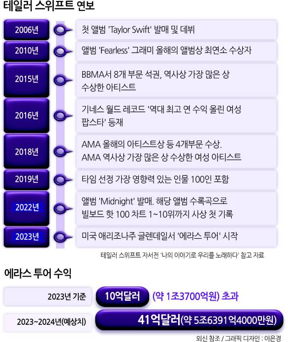 스위프트는 2023년 3월 17일부터 무려 5개 대륙을 돌며 152차례의 공연을 진행하는 ‘에라스 투어’를 하고 있다.