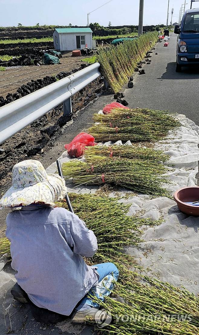 (제주=연합뉴스) 김호천 기자 = 말복을 하루 앞둔 13일 오전 제주시 구좌읍 김녕리의 도로변에서 한 농민이 참깨를 털고 있다. 2024.8.13