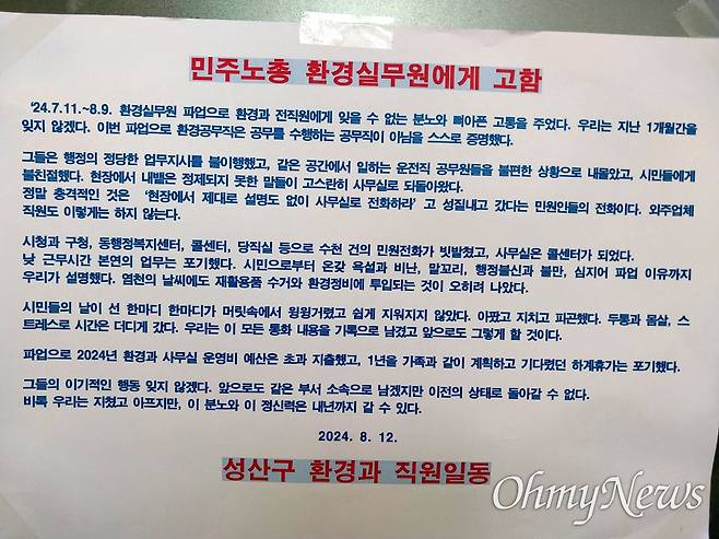 일반노조, 창원 성산 환경과 직원일동 '글' 고발... 왜냐면