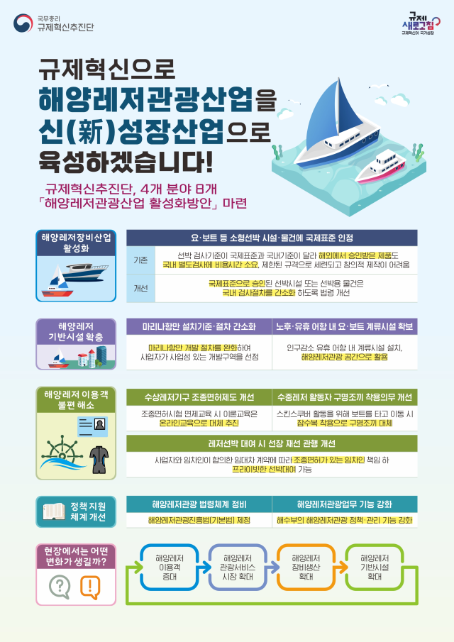 세계관광기구에 따르면 전 세계 관광에서 해양 분야가 차지하는 비중은 2023년 기준 50% 이상이다. 특히 한국은 조선, 정보기술(IT), 자동차 등 해양 레저 장비와 관련된 산업이 발달해 경쟁력을 갖출 잠재력이 있다. 정부 관계자는 “후속 조치를 신속히 추진하고 숨어 있는 불합리한 규제를 계속 개선할 것”이라고 강조했다.