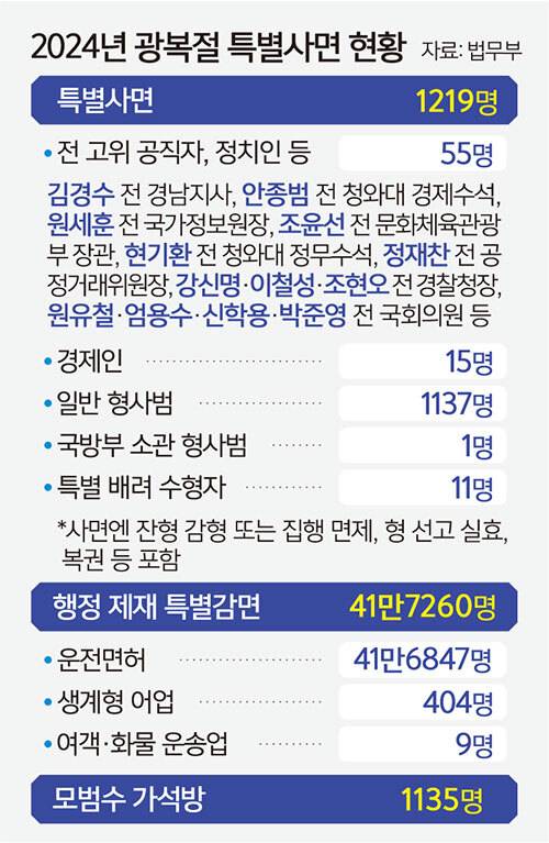 특사 대상자 대부분, 1137명은 일반 형사범이다. 생계를 위한 운전 중 교통사고로 처벌된 버스나 택시 기사 등 운전업 종사자가 270명으로 가장 많고, 19∼34세 청년은 111명이다. 중소 기업인과 소상공인은 20명으로, 경영 악화로 대금을 정산하지 못해 사기죄로 처벌받은 경우다. 정부는 “경제 역동성을 높이고 민생 안정을 지원하기 위해 재기의 기회를 부여한다”고 취지를 설명했다.