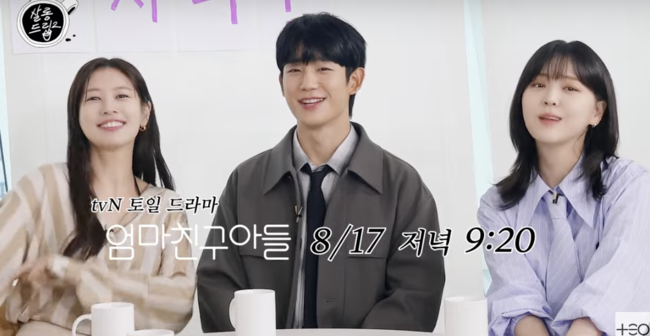세 사람이 호흡을 맞춘 이번 드라마 ‘엄마친구 아들’ 에 대해 이야기를 나눴다. 홍보 담당은 정해인이라고 했으나 제대로 말 못 하자 정소민은 “다른 사람들이 모르는 특징 찾았다”며 “당황하거나 무서우면 한국말을 잘 못 하더라떠오르는 단어만 나열한다”고 했다. 이에 정해인은 “있는대로 다 드러내야해서 단어라도 다 말했다”며 민망,“사실 로맨틱 코미디는 처음, 그전 작품을 멜로에 가깝다”고 했다. 이에 정해인은 “코미디는 전소민이 경험이 있어 현장에서 리드를 잘 해준다”며 역시 칭찬했다.