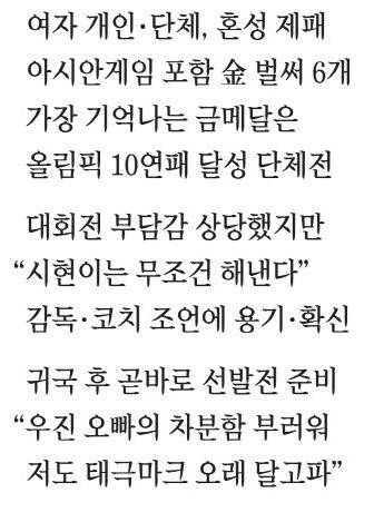 생애 처음 출전한 올림픽에서 따낸 금메달 3개 중 가장 값진 것은 무엇일까. 잠시 고민한 임시현은 한국 여자 양궁 대표팀의 올림픽 10연패를 완성하게 된 여자 단체전 금메달을 꼽았다. 그는 "선배들의 역사를 이어갔다는 안도감과 내 손으로 올림픽 10연패를 달성했다는 뿌듯함에 가장 기억에 남는다"며 "여자 단체전 결승에서 마지막 화살이 10점에 들어간 것을 확인한 뒤 환호했던 게 지금도 생생하게 떠오른다"고 설명했다. 결과는 올림픽 3관왕이었지만 이번 대회 시작에 앞서 임시현이 느끼는 부담감은 상당했다. 임시현은 "올림픽에서 내가 잘할 수 있을까라는 걱정을 했던 것도 사실이다. 다행히 감독님과 코치님 등 주변에서 '시현이는 무조건 해낸다'는 자신감을 불어넣어주셨다"고 말했다.