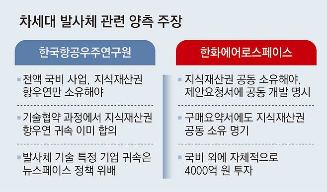 발사체 개발 사업 주체인 한국항공우주연구원과 민간 참여 기업인 한화에어로스페이스가 발사체 관련 지식재산권 소유 여부를 두고 다툼이 벌어진 것.