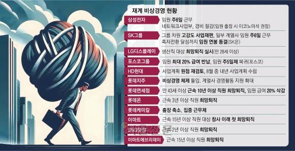 희망퇴직과 별개로 비상경영을 선포하는 대기업도 늘고 있다. 국내 10대 그룹 가운데 6개 그룹이 경비 절감과 인원 감축 등 비상경영 체제에 들어갔다. 상위 4대 그룹 가운데 전기차 캐즘(일시적 수요 둔화)에도 북미 시장을 중심으로 호실적을 이어 가고 있는 3위 현대차그룹을 제외한 삼성(1위), SK(2위), LG(4위) 그룹이 주력 계열사별로 비상경영을 이어 가고 있고 포스코(5위), 롯데(6위), HD현대(8위)도 위기 극복을 외치며 허리띠를 졸라매고 있다.
