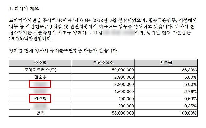 | ▲ 김건희 여사와 A씨는 도이치파이낸셜 유상증자에 참여했다. A씨(적색 테두리선)는 2014년 12월 31일 기준 290만 주(지분율 5%), 김건희 여사는 40만 주(지분율 0.69%)를 각각 갖고 있었다. 도이치파이낸셜 감사보고서. |