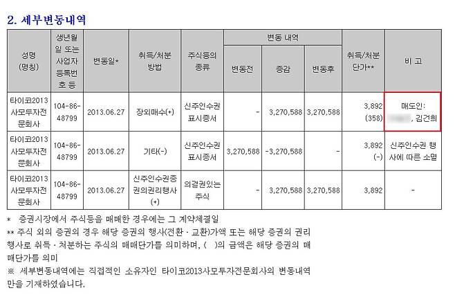 금융감독원 공시자료에 따르면 김 여사는 2012년 11월 13일에 51만 464개의 신주인수권을 권 회장으로부터 장외매입했다. 같은 날 허아무개씨와 정아무개씨도 권 회장으로부터 각각 63만 8080개의 신주인수권을 권 회장으로부터 매수했는데, 이들의 신주인수권을 2013년 2월 7일 장외매입한 사람이 A씨다. 또한 A씨는 같은 날 산업은행이 갖고 있던 신주인수권 256만 9373개를 한양증권을 통해 장외매입했다. 그리고 김 여사와 A씨는 2013년 6월 27일 신주인수권 327만 588개를 타이코2013사모투자전문회사에 매도했다.