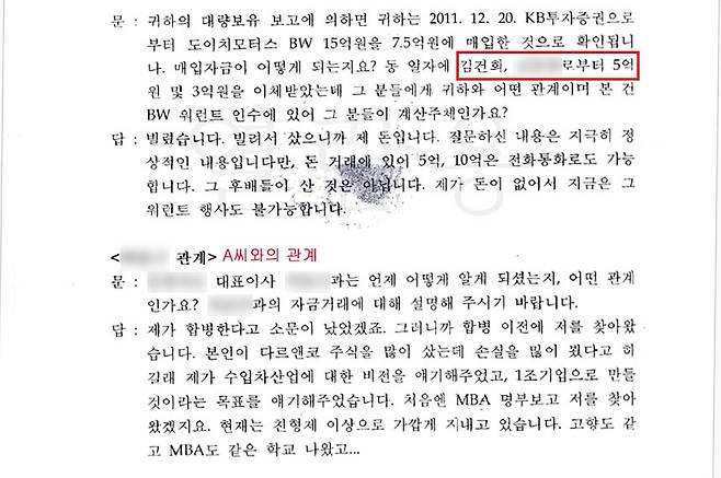 | ▲ 2012년 8월 30일 권오수 도이치모터스 전 회장의 서면문답서 중 일부. 당시 금융감독원은 도이치모터스 주식 불공정 거래 여부와 관련하여 김건희 여사와 권 회장 사이의 금전 거래 내역 그리고 A씨와 권 회장 관계 등에 대해 조사했다. |