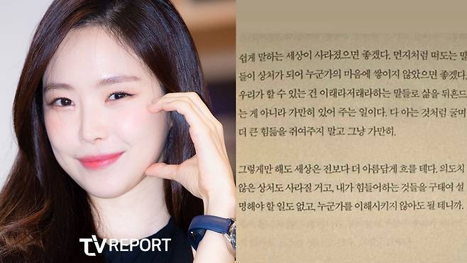 사진 속 책에는 "쉽게 말하는 세상이 사라졌으면 좋겠다. 먼지처럼 떠도는 말들이 상처가 되어 누군가의 마음에 쌓이지 않았으면 좋겠다. 우리가 할 수 있는 건 이래라저래라 하는 말들로 삶을 뒤흔드는 게 아니라 가만히 있어 주는 일이다. 다 아는 것처럼 굴며 더 큰 힘듦을 쥐여주지 말고 그냥 가만히"라며 "그렇게만 해도 세상은 전보다 더 아름답게 흐를 테다. 의도치 않은 상처도 사라질 거고, 내가 힘들어하는 것들을 구태여 설명해야 할 일도 없고, 누군가를 이해시키지 않아도 될 테니까"라고 적혀 있었다.