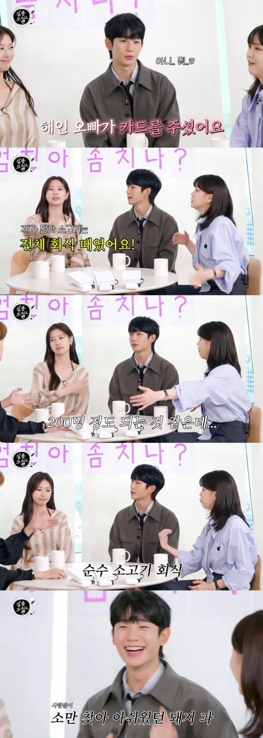 또한 김지은은 “스태프분들만 회식하는 자리가 있었는데 내가 돈을 아직 많이 못 버니까 ‘우리 스태프 기죽지마’라고 소정의 돈을 전달했는데 다시 돌려줬다. 그래서 이유를 물어보니 ‘해인 오빠가 카드를 주셨어’라고 하더라”라고 회상했다.