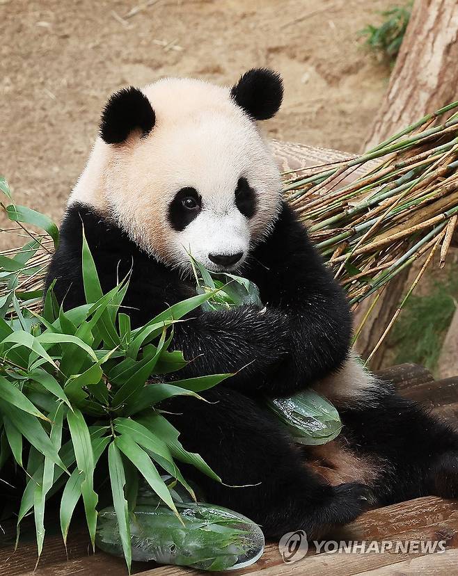 (용인=연합뉴스) 홍기원 기자 = 절기상 말복인 14일 오전 경기도 용인시 에버랜드에서 쌍둥이 판다 후이바오가 주키퍼(사육사)들이 준비한 얼음으로 만든 장화로 더위를 식히고 있다. 2024.8.14