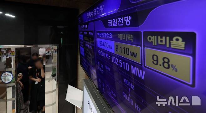 [서울=뉴시스] 김선웅 기자 = 폭염이 이어지고 있는 14일 서울 중구 한국전력공사 서울본부에서 모니터에 전력 수급현황이 표시되고 있다.