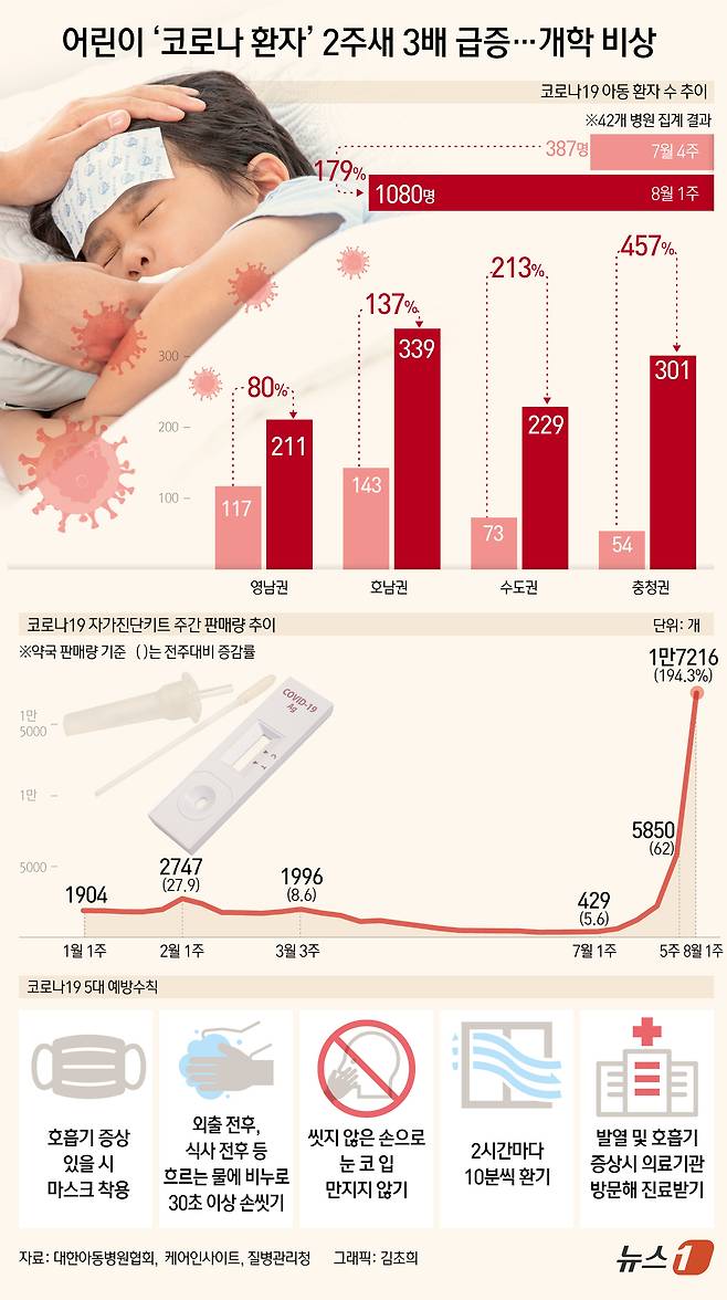 (서울=뉴스1) 김초희 디자이너 = 대한아동병원협회는 14일 "지난 10~13일 전국 117개 회원병원 중 코로나19 아동 환자 수 조사에 참여한 42개 병원을 상대로 집계한 결과 이같이 파악됐다"고 밝혔다. 7월 넷째 주(7월 22~26일) 환자 수가 387명이었던 데 비해 8월 첫째 주(8월 5~9일) 환자 수는 1080명으로, 2주 사이에 2.8배(693명) 증가했다. 코로나19가 재유행하면서 자가진단 키트 판매량도 급증하고 있다. 약국 데이터 분석 서비스인 케어인사이트에 따르면 지난 4~10일 국내 약국의 코로나19 자가진단키트 판매량은 1만7216개로 전주(7월 28일~8월 3일) 5850개 대비 194.3% 증가했다.