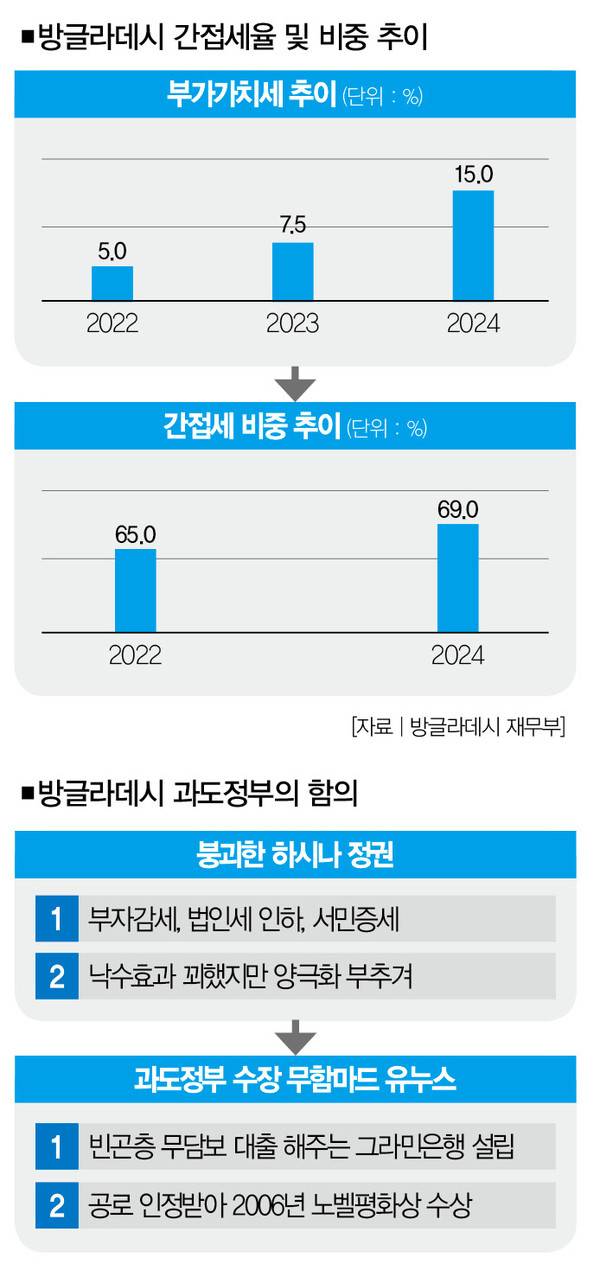 ■ 불평등 굳히기=부자감세와 법인세 인하로 부족해진 세수는 불평등을 조장하는 간접세로 해결했다. 방글라데시 집권세력은 소득이나 재산의 규모와 상관없이 부과하는 부가가치세 세율을 2022년 5%에서 2023년 7.5%로, 올해엔 15%로 상향 조정했다. 이에 따라 전체 세금에서 간접세가 차지하는 비중은 2021년 65%에서 2023년 69%까지 커졌다.