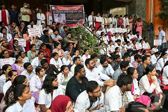 (하이데라바드 AFP=뉴스1) 김지완 기자 = 14일(현지시간) 인도 텔랑가나주 하이데라바드의 간디 병원에서 의사들이 한 여성 의사의 성폭행·살인 사건에 항의하는 시위를 벌이고 있다. 지난 9일 서벵골주 콜카타의 한 공립병원에서 여성 전문의(31)가 같은 병원 직원에 의해 성폭행당하고 살해된 사건이 발생하자 인도 각지의 국립병원 의사들은 12일 진료를 무기한 중단하고 파업에 나섰다. 2024.08.14