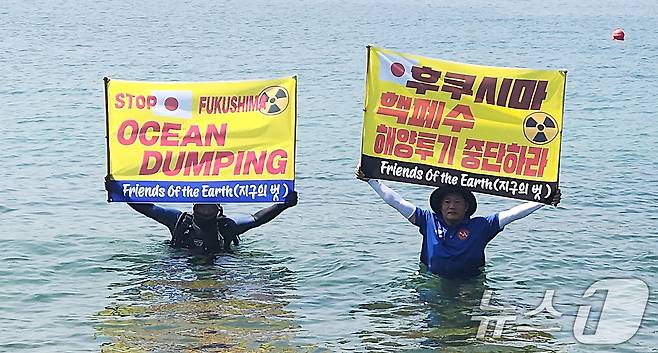 (서울=뉴스1) = 환경운동연합 바다위원회와 여수지역 환경단체 '해양환경인명구조단' 회원들이 14일 오전 전남 여수 인근 금오도에서 일본의 후쿠시마 핵폐수 해양투기 중단을 촉구하며 해상시위를 하고 있다. (환경운동연합 제공) 2024.8.14/뉴스1
