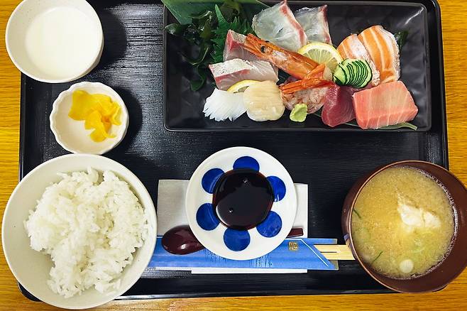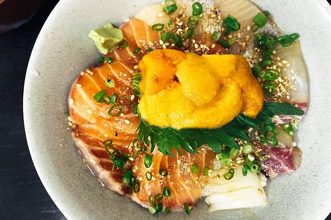 시그니처는 역시 해산물 덮밥과 해산물 정식. 새우, 참돔, 방어, 연어, 참치뱃살, 참치등살, 가리비, 오징어 사시미가 담겨 나온다. 2,000엔에 성게가 올라가 있는 우니동도 맛볼 수 있다. 생각보다 우니가 엄청 넉넉하게 올라가 있고, 다시마에 숙성시킨 연어와 방어가 아래 깔려 나온다.