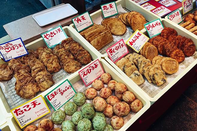 명란을 넣은 어묵, 우동면과 생선살을 다져 만든 어묵, 소시지, 양파, 베이컨, 치즈 등을 넣은 어묵, 오사카 지역의 빨간 생강을 넣은 어묵, 이외에도 새우살을 다져 슈마이처럼 만든 어묵 등 종류가 무척 다양하다. 전부 이곳에서 직접 손으로 만드는 수제 어묵이고, 이것저것 골라 접시에 담으면 그 자리에서 다시 튀겨준다.