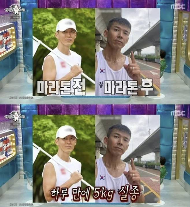 마라톤을 즐겨하는 션은 "마라톤을 뛰면 공기를 뺀 것처럼 얼굴도, 몸도 쫙 빠진다"면서 "하루 만에 5kg가 빠진다"고 언급했다.