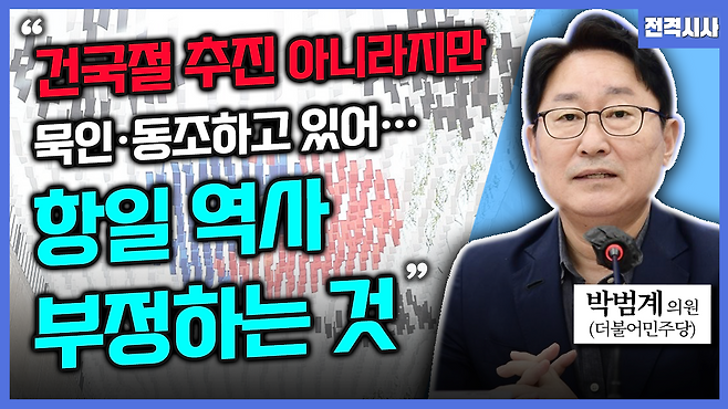 ▶ 박범계 : 우리 고 박사님도 그 논리에도 일리가 있습니다. 정부가 공식적으로 건국절을 추진한다거나 그것을 표방한 것이 아닌데 왜 야당이 이렇게 크게 분노하느냐, 크게 반대하느냐라는 말씀인데 아까도 제가 그래서 장황하게 역사적 과정을 설명했고 소위 뉴라이트라는 분들이 어느 시점에서 생겨났고 최초에는 북한 인권을 지적하면서 소위 말해서 예전에 학생운동하던 몇몇 분들이 시작해서 몇몇 정치인들 학자들 해서 재단도 만들어지고 그렇지 않았습니까?: 정부의 보수 정부의 공식적인 입장은 아니지만 대체로 정부와 관련된 분들 또 지금의 여당 정치인들도 꽤 있고 이 건국절 논쟁이 사그라들지 않고 계속 이어져 왔고 정부가 표방하지는 않았지만 묵인하고 있는 아니면 내지는 동조하고 있는 제가 아까 말씀드렸듯이 윤석열 대통령께서 집권하시자마자 적어도 4가지 이상 적어도 친일적인 그것은 국민 정서에 어긋나는 그러한 어떤 결정들 그러한 지침들을 했기 때문에 그것이 그냥 정부가 공식적으로 표방하지 않았는데 왜 그러냐라는 그런 논리는 저는 적반하장이라고 생각해요.