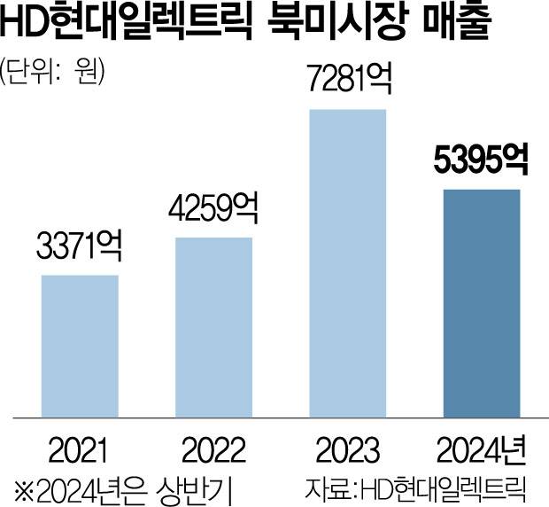 한편 사업 다각화를 통해 올해 HD현대일렉트릭은 북미 시장에서만 1조 원이 넘는 매출을 달성할 것으로 보인다. 올 상반기 회사는 총 5395억 원의 매출을 기록했는데 현재 전체 수출 잔액의 60%에 육박한다.