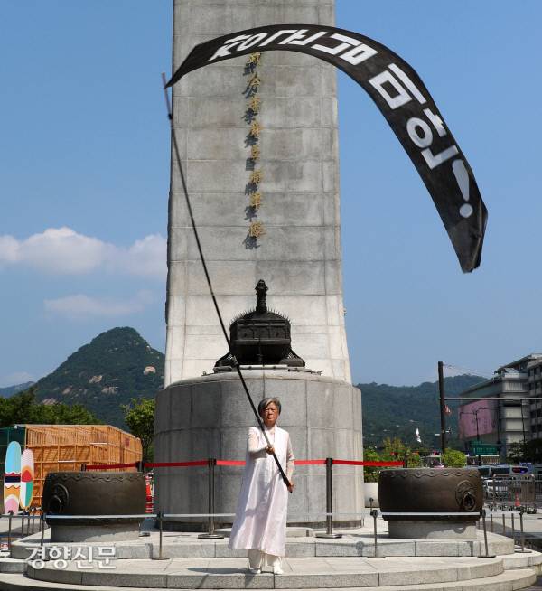 양혜경 항일여성독립운동기념사업회 이사장이 광복절인 15일 서울 광화문광장 이순신장군 동상 앞에서 '장군님 미안!'이라고 써진 만장을 들고 윤석열 정부의 두 쪽 난 광복절 기념식을 비판하는 퍼포먼스를 펼치고 있다. 2014년 창립된 항일여성독립운동기념사업회는 우리 사회에서 잊혔던 여성 항일독립운동가들을 발굴하고 기념사업을 하는 독립운동단체다. 2024.08.15. 정지윤 선임기자