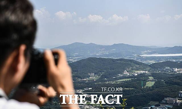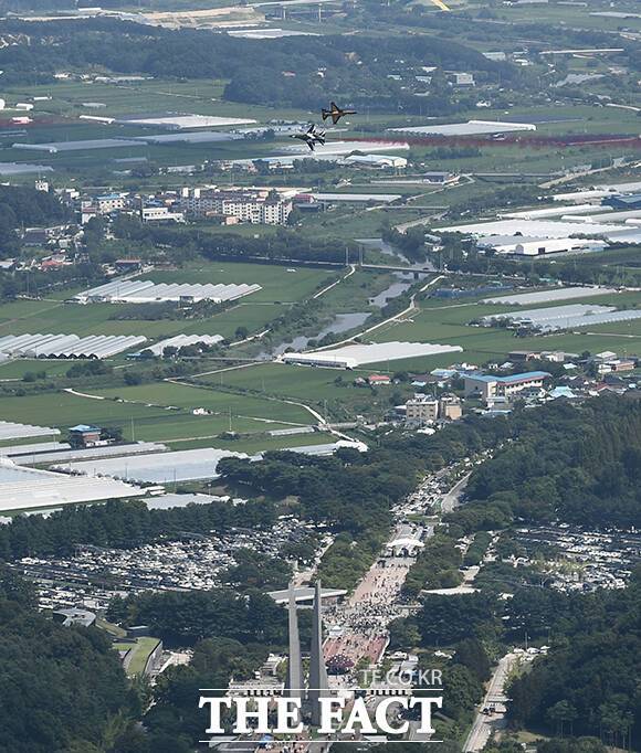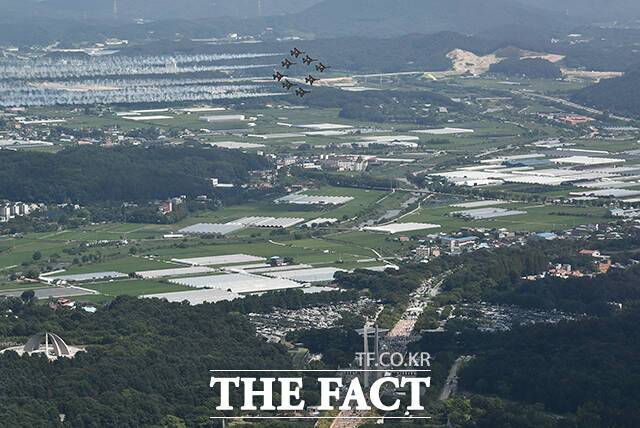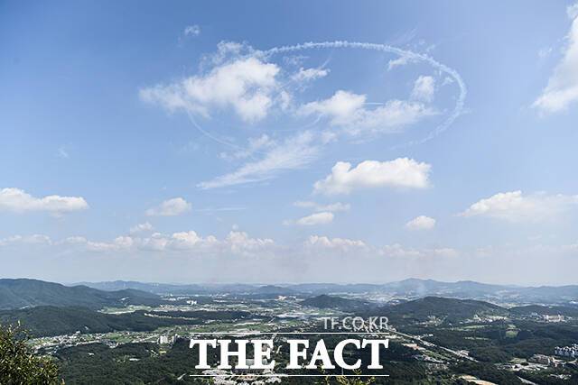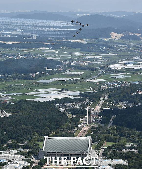 '독립기념관 상공에 펼쳐진 하트' 광복절 축하 비행하는 블랙이글스 [TF사진관]