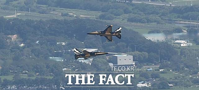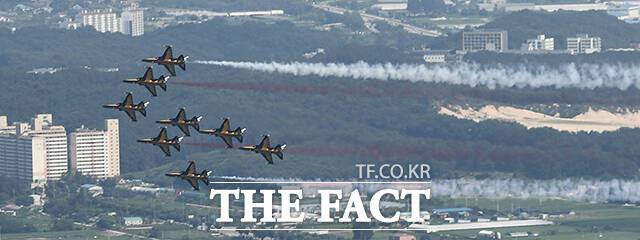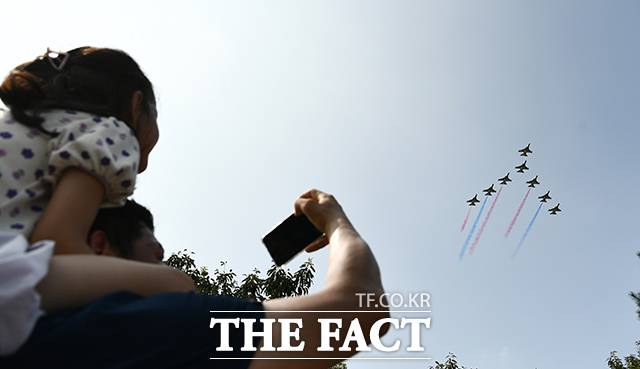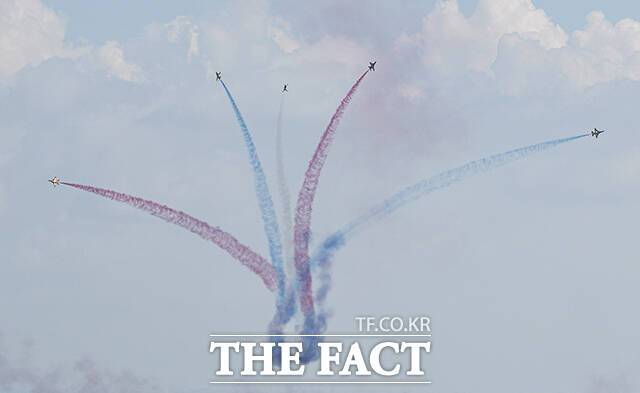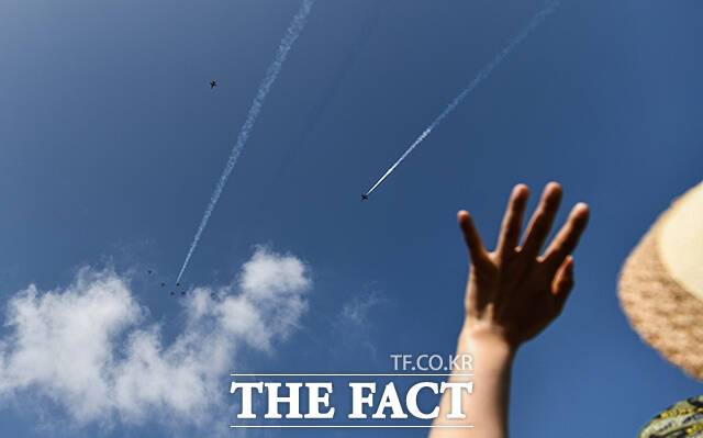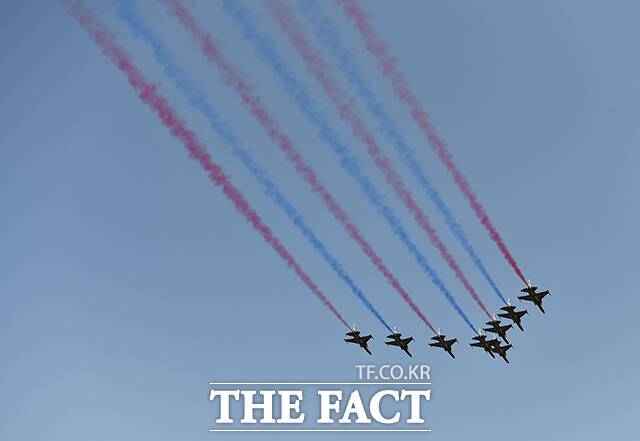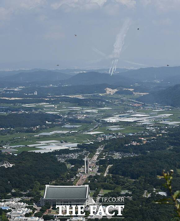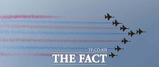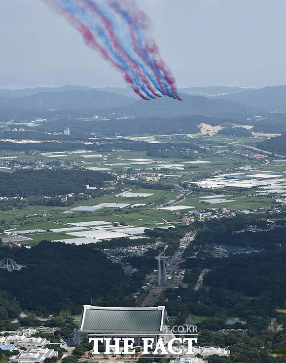 [더팩트|천안=박헌우 기자] 공군 특수비행팀 블랙이글스가 15일 오후 충남 천안 독립기념관에서 광복절 경축 문화 행사 축하 비행을 선보이고 있다.