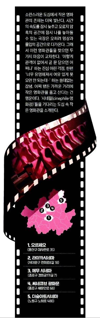 소란스러운 도심에서 작은 영화관의 존재는 더욱 빛난다. 시간의 속도를 잠시 늦추고 오로지 암흑의 공간에 잠시 나를 놓아둘 수 있는 극장은 오히려 명상과 몰입의 공간으로 다가온다. 그래서 이런 영화관들을 찾으면 두 가지 마음이 교차한다. ‘이렇게 관객이 없어서 곧 문 닫으면 어쩌나’ 하는 진심 어린 걱정, 한편 ‘너무 유명해져서 여유 있게 못 오면 안 되는데…’ 하는 쓸데없는 잡념. 어찌 됐든 가까운 거리에 작은 영화관을 품고 산다는 건 행운이다. ‘시네필(cinephile·영화광)’들을 기다리는 도심 속 작은 영화관을 소개한다.