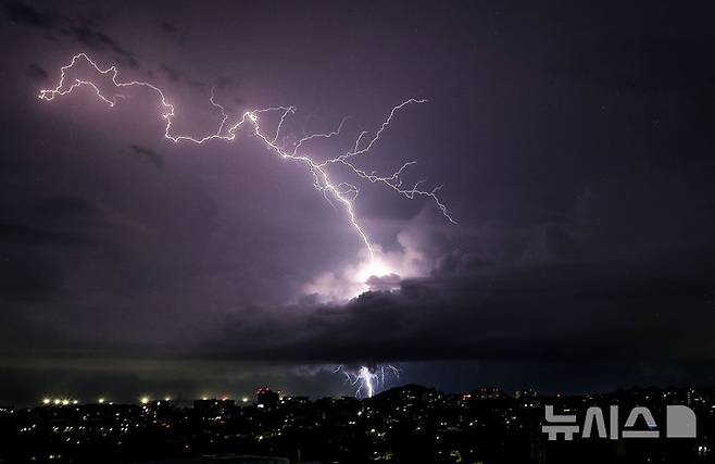[제주=뉴시스] 우장호 기자 = 저기압대가 통과하며 대기가 불안정한 16일 자정 제주시 오라2동에서 바라본 동쪽 하들에 밤하늘을 밝히는 번개가 치고 있다. 2024.08.16. woo1223@newsis.com