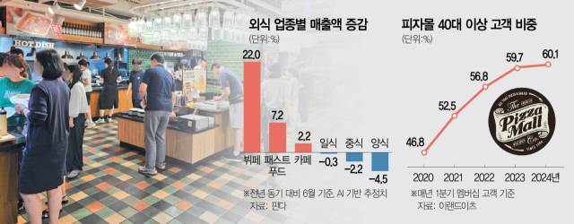 15일 식품업계에 따르면 상반기 이랜드이츠 피자몰 중 뷔페식 매장의 매출은 지난해 같은 기간보다 10% 올랐다. 팬데믹이 한창이었던 2022년보다는 40% 상승했다. 평일 점심 기준 1만2900원의 가격대에 7종 이상의 피자와 샐러드바 메뉴를 제공하는 점이 장기화되는 외식 물가 상승 국면에서 주목받은 결과다. 실제 피자몰에서는 주로 가족 단위로 방문해 외식 물가에 더욱 민감한 40대 이상 고객이 크게 늘고 있다. 2020년 46.8%에 불과했던 피자몰 뷔페 매장의 40대 이상 고객 비중(멤버십 기준)은 매년 증가해 올해 1분기 60.1%를 기록했다. 대학생 고객층을 중심으로 무한리필 식당이 인기를 끌었던 이전과는 달라진 현상이다. 회사 관계자는 “피자몰은 여러 이랜드이츠 뷔페 브랜드 중에서도 유독 젊은 층 멤버십 방문객이 많았던 편이지만, 점차 40대 이상의 비율이 늘어나는 추세”라고 설명했다.