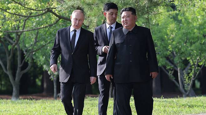 ▲ 지난 6월 20일 금수산영빈관 정원구역에서 함께 산책하는 김정은 북한 국무위원장과 블라디미르 러시아 푸틴 대통령(왼쪽)