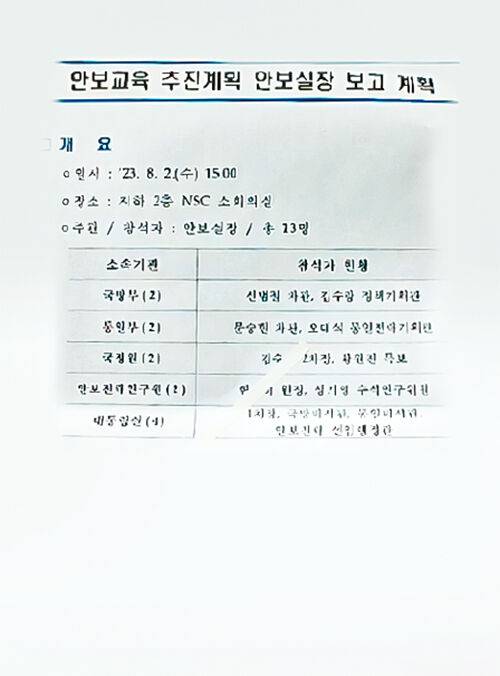 SBS가 입수한 국방부의 한 문건은 안보실장 주관의 '안보교육 추진 회의' 요약본입니다. 작년 8월 2일 대통령실 지하 2층 NSC 소회의실에서 안보실의 실장과 1차장, 그리고 국방부, 국정원, 통일부의 차관급과 국장급 인사, 안보전략연구원 고위직 등이 참석한 회의였습니다.