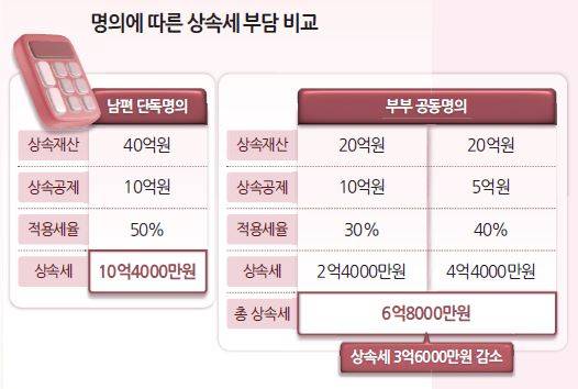 하지만 부부가 재산을 나누어 가지고 있다면 어떨까요. 20억원씩 재산을 가진 부부가 사망했다고 단순 가정했을 때, 상속세는 두 차례로 나눠 납부합니다. 각각 2억4000만원, 4억4000만원 수준입니다. 이 경우 홀로 재산을 보유했을 때보다 3억6000만원가량 세금을 절약하는 셈입니다.