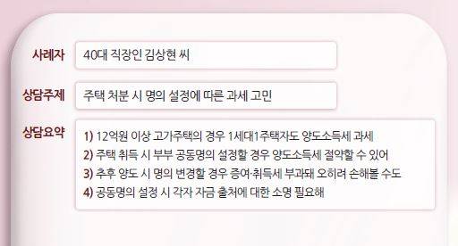 하지만 반전이 있었다. 김씨의 주택이 처분 시 세금이 부과되는 고가주택에 해당하는 것이었다. 심지어 세금 규모도 적지 않아, 미리 골라놓은 매물을 구매하기 힘든 상황에 처했다. 그러다 ‘한 줄기 희망’을 발견했다. 사연을 들은 직장 동료가 주택을 부부 공동명의로 변경할 시 세금이 면제될 수 있다는 조언을 해준 것이다. 매력적인 방안을 듣고 마음이 급해진 김씨는 사실 확인을 위해 세무전문가 ‘절세미녀’를 찾았다.