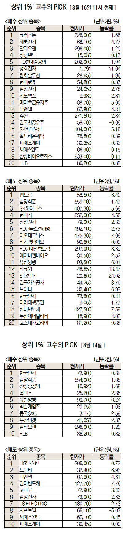 미래에셋증권은 자사 고객 중에서 지난 1개월간 수익률 상위 1% 투자자들의 매매 종목을 집계해 실시간·전일·최근 5일 기준으로 모바일트레이딩시스템(MTS)상에서 공개하고 있다. 이 통계 데이터는 미래에셋증권의 의견과 무관한 단순 정보 안내이며 각각의 투자자 개인에게 맞는 투자 또는 수익 달성을 보장하지 않는다. 또 테마주 관련 종목은 이상 급등락 가능성이 있으므로 유의해야 한다.