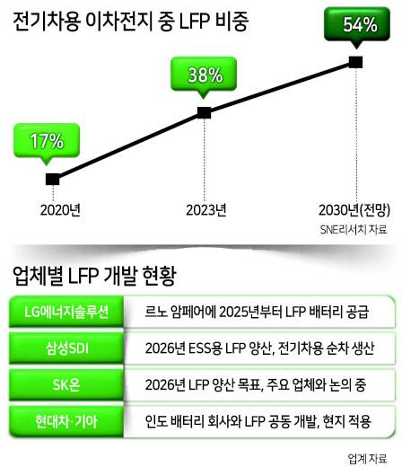 시장조사업체 SNE리서치에 따르면 LFP 배터리 비중은 2020년 17%에서 2023년 38%까지 확대됐다. SNE리서치는 2030년에는 LFP 배터리가 시장의 54%를 점유할 것으로 전망한다.