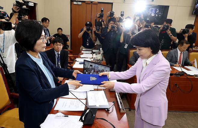 | ▲ 국회 탄핵소추안 가결로 직무 정지된 이진숙 방송통신위원장이 14일 오후 서울 여의도 국회 과학기술정보방송통신위원회에서 열린 방문진 이사 선임 등 방송장악 관련 2차 청문회에서 증인선서를 한 뒤 최민희 과학기술정보방송통신위원회 위원장에게 선서문을 건네고 있다. |