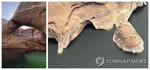 This combination of photos provided by the National Park Service shows the Double Arch intact in Rock Creek Bay at the Glen Canyon National Recreation Area, Utah, left, and after its collapse, Friday, Aug. 9, 2024. (Jacob E. Ohlson/National Park Service via AP) AP PROVIDES ACCESS TO THIS PUBLICLY DISTRIBUTED HANDOUT PHOTO PROVIDED BY THE NATIONAL PARK SERVICE; MANDATORY CREDIT