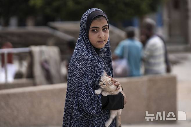 [데이르 알발라=AP/뉴시스] 16일(현지시각) 가자지구 데이르 알발라의 학교 대피소에서 한 팔레스타인 소녀가 고양이를 안고 이스라엘군의 대피령에 따라 학교를 떠나고 있다. 이스라엘은 가자지구 남부 칸유니스와 동부 데이르 알발라에서 이스라엘을 향한 로켓에 대응할 것이라며 주민들에게 대피를 요구하는 전단을 뿌렸다. 2024.08.17.