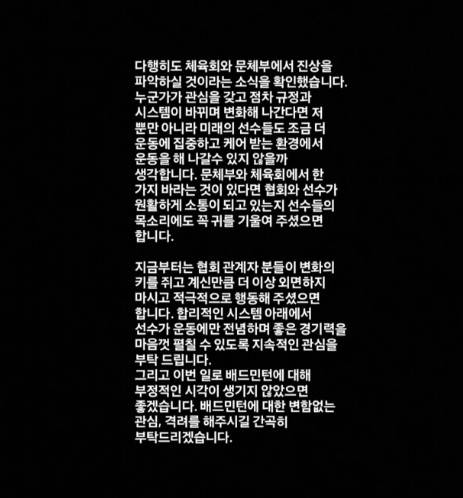 안세영은 "(대한배드민턴)협회 관계자분들이 변화의 키를 쥐고 계신 만큼 더 이상 외면하지 마시고 적극적으로 행동해주셨으면 한다. 합리적인 시스템 아래 선수가 운동에만 전념하며 좋은 경기력을 마음껏 펼칠 수 있도록 지속적인 관심 부탁드린다"고 말했다.