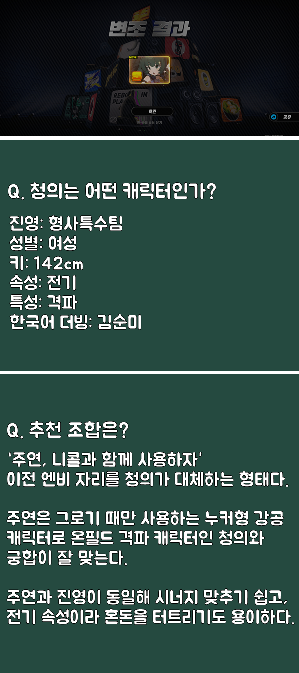 손이 아픈 것을 제외하면 지금까지 출시된 격파 S급 캐릭터 중 독보적인 성능, 우월한 타격감을 자랑한다. 돌파 및 전용 엔진을 크게 타지 않는 것도 장점이다. 전기 속성 파티를 꾸릴 생각이 있거나 주연을 보유하고 있다면 반드시 뽑는 것을 추천한다.