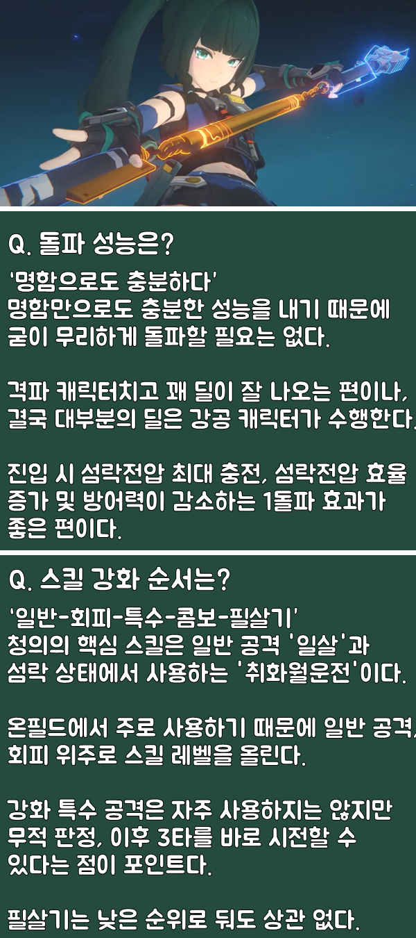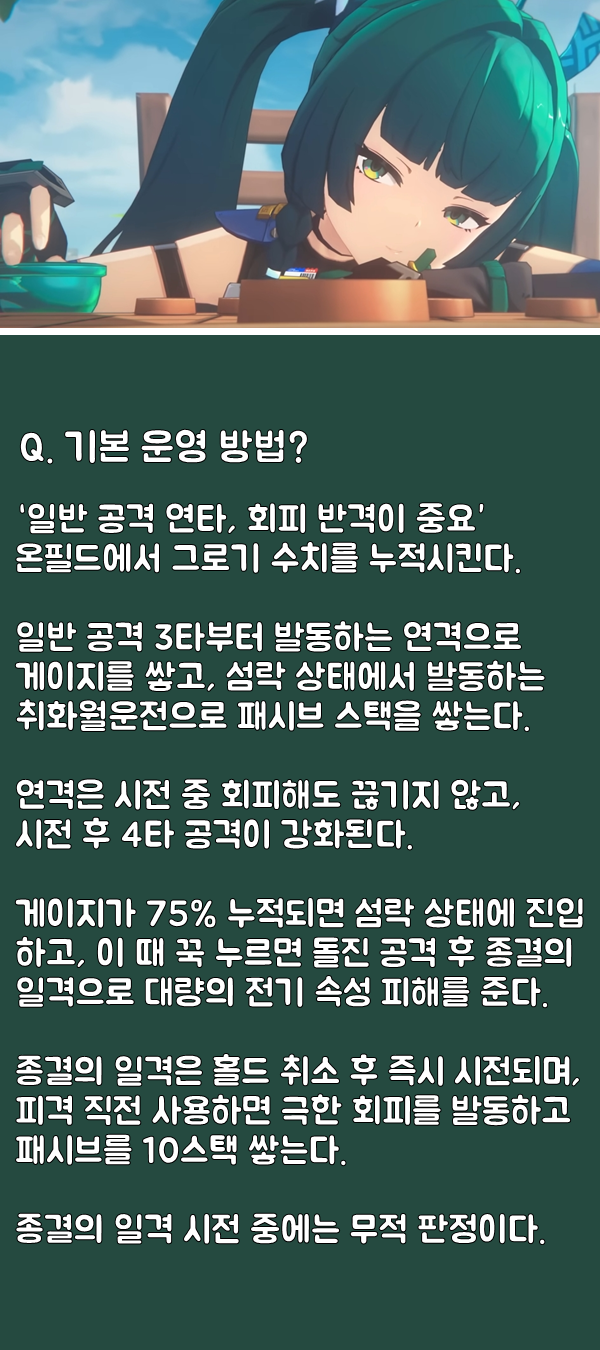 취화월운전은 무적 판정 및 패시브 누적, 딜링까지 빠질 수 없는 청의의 핵심 스킬이다. 종결의 일격 활용도에 따라 청의의 생존력이 달라지니 꼭 컨트롤을 손에 익히길 권한다.