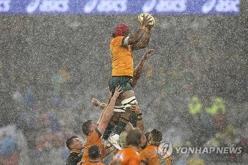 Australia's Seru Uru, top, takes a line out ball against South Africa during their rugby union test match in Perth, Saturday, Aug. 17, 2024. (AP Photo/Trevor Collens)
