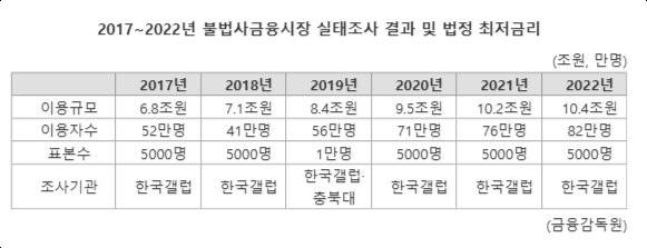 지난 2018년 말 기준 41만명 수준이었던 불법사금융 이용자수는 2022년 82만명으로 집계됐다. 지난 2017년 첫 조사에서 52만명으로 추정됐던 불법사금융시장 이용자수는 2018년 11만명의 감소를 보인뒤, 2019년 56만명으로 다시 증가했다. 이후 2020년(71만명), 2021년(76만명)으로 증가세를 기록했다.