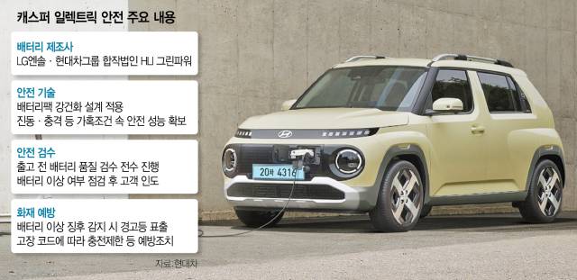 현대차는 최근 캐스퍼 일렉트릭 사전 계약자를 대상으로 캐스퍼 일렉트릭의 배터리 제조사와 안전 기술 등을 별도로 안내했다. 캐스퍼 일렉트릭은 LG에너지솔루션과 현대차그룹의 합작법인인 HLI그린파워에서 생산한 니켈·코발트·망간(NCM) 배터리를 탑재했다. 배터리팩은 진동·충격 등 가혹 조건에서도 안전 성능을 갖추는 강건화 설계를 적용했다. 배터리 이상 징후 감지 시에는 경고등 표출과 충전 제한 등 사고 예방 조치를 시행한다.