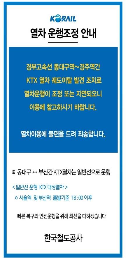 현재 상행선은 부산~동대구간 일반선으로 우회 운행 중이다. 궤도 이탈 여파로 동대구에서 부산을 향하는 KTX와 SRT 열차들이 줄줄이 지연됐다. 포항으로 가는 열차도 일부 지연되고 있다. 정확한 사고 원인은 아직 밝혀지지 않았다.